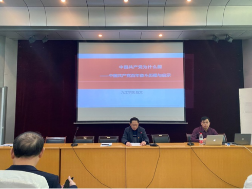 学习会上,赵文博士以《中国共产党为什么能——中国共产党百年奋斗历程与启示》为题,通俗易懂深入浅出地介绍了“为何要学习党史”、“中共党史中若干重大问题回顾”、“百年党史学习的主要启示”等三部分内容,使全院教师深受教育。