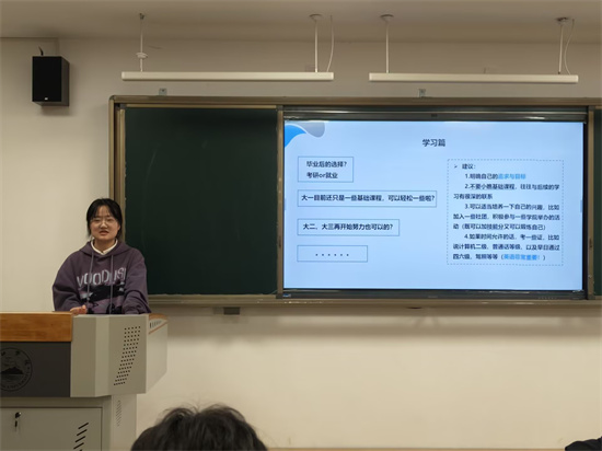 朱文洁首先分享了她对大一基础课程学习重要性的看法,她认为这是构建专业基础的关键时期,并强调了积极的学习态度对于大学成功的重要性;她还分享了自己在入党和考证方面的经验,鼓励新生们积极参与,为个人发展添砖加瓦。