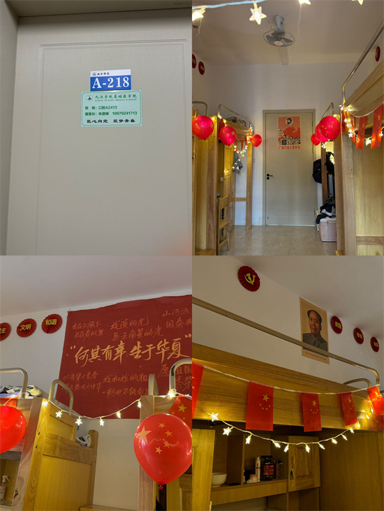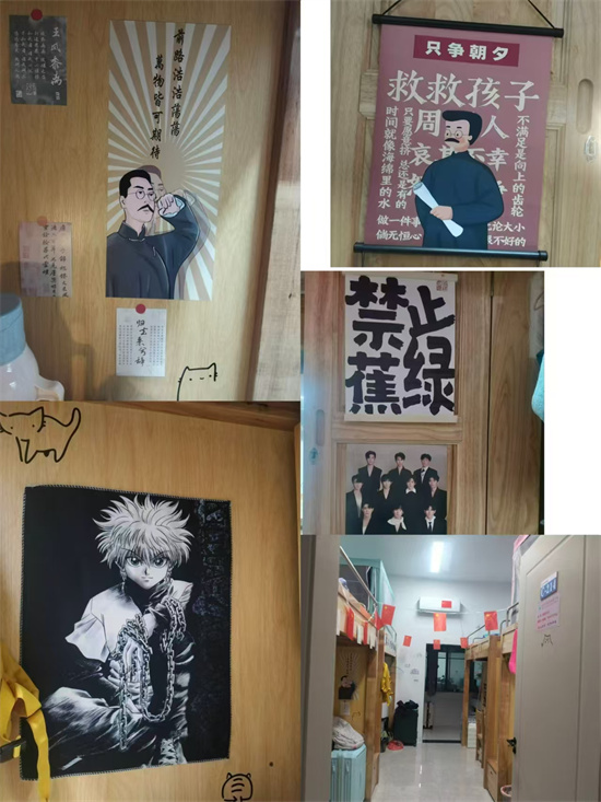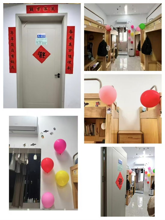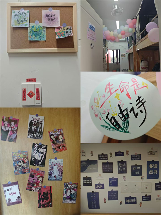 同学们发挥创意,使用各种环保材料积极参与到寝室设计中。有的寝室用小红旗点缀,彰显爱国情怀;有的寝室利用废纸折叠出好看的图案悬挂在墙壁上,既美观又环保……。在最后的评选阶段,评委们分别在寝室卫生洁净、内务整理、安全用电和美化设计四个方面进行了打分,最后有14间女寝,10间男寝在此次寝室文化节获奖。