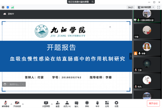 11月23日,医学院组织召开2018级预防医学专业本科毕业论文(设计)开题答辩会,受疫情影响,本次开题答辩会在线上举行。全体论文指导教师和2018级预防医学专业36名员工分4组展开论文开题答辩,医学院经理车向新、党委书记许晓源、副经理向维聂、熊建军等院领导分别参与并指导各小组开题答辩。