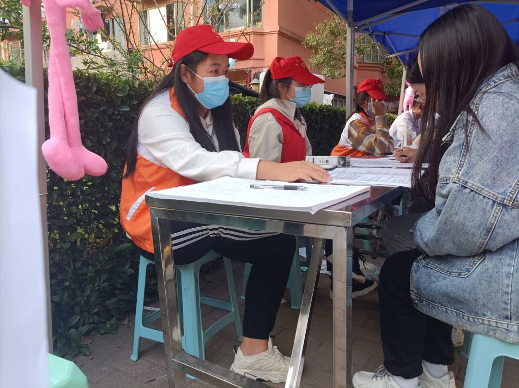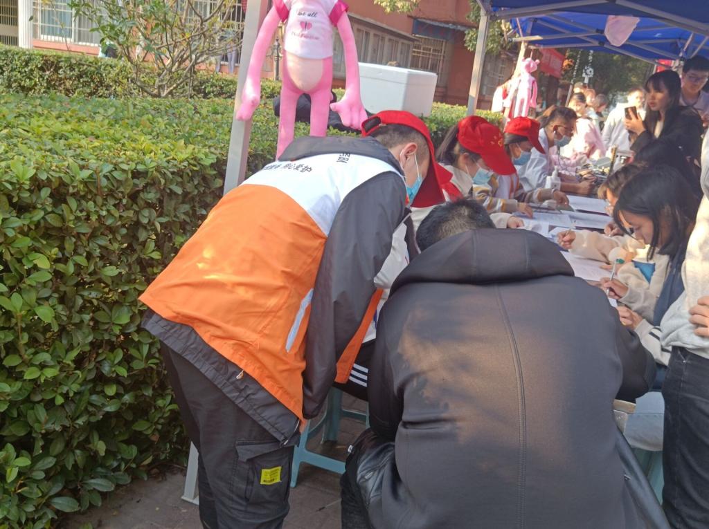 早上9点,伴随着温暖的阳光,活动正式开始。志愿者们在献血站工作人员的帮助讲解下可以正确的回答同学们关于献血前事项的专业知识并指导同学们正确填写了相关表格。在填写完表格后,经过测血压,验血型等一系列流程后,在我们志愿者的带领下有序地进入献血车开始献血。