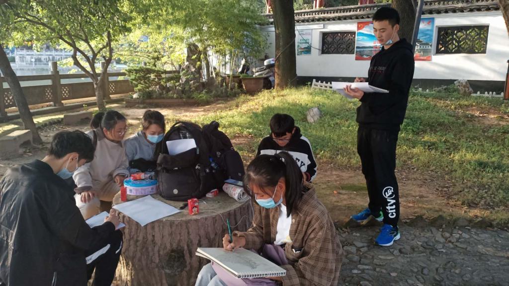 大家聚集在烟水亭,一同领略画廊雕柱,碧波荡漾,绿意盎然,短暂的合影留念后,寻了一处最佳角度,在一颗大树下的一张石桌坐下,围成一圈,伴着树下的斑驳阳光和清幽雅致的景色取出画纸、画笔作画。同学们三三两两地聚在一起讨论着,学长在作画的同时耐心地指导新生,成员们都静心凝神地感受、发现自然的不经意间的美,凝神屏息,认真地执笔作画,独特的自然视角为艺术注入了开阔的创作视野和新鲜灵动的元素,一幅幅画作逐渐成型,古朴清雅的烟水亭跃然纸上。最后,成员们面对面交流心得,社长作出了整体点评和总结。夕阳西下,写生活动也在如画美景中圆满结束。