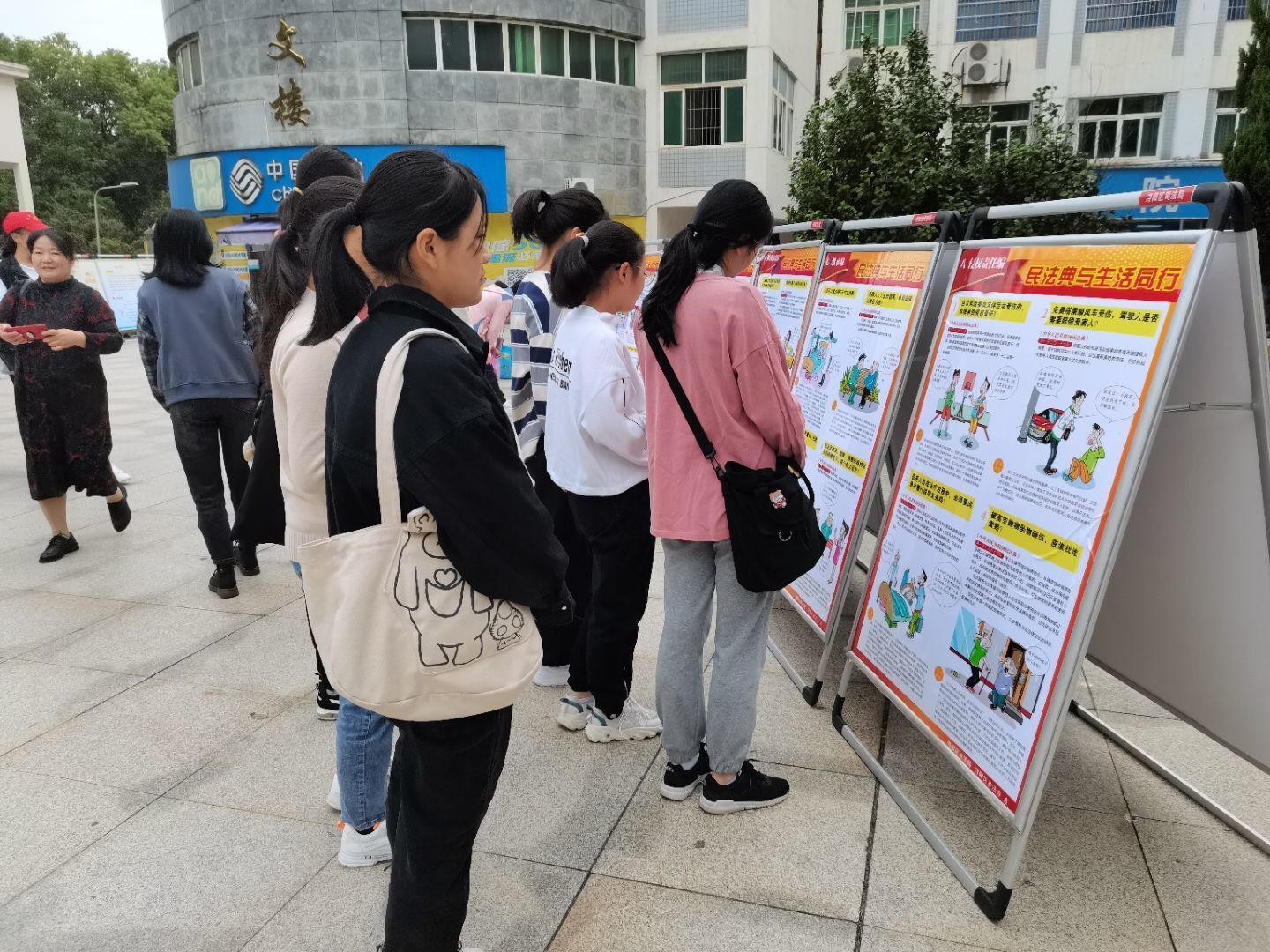 普法知识讲座开始之前,志愿者们在华文楼下为大家展出了普法主题知识展板,在校园内挂好横幅,发放宣传手册,引来了同学们的观看。