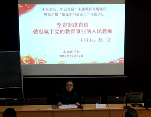 12月12日,伟德国际1946官网在浔东校区立本楼三楼报告厅召开党的十九届四中全会精神学习会暨第六期“德先生与德医生”立德讲坛,邀请学校宣讲团成员、马克思主义学院赵文博士进行宣讲,公司党委班子和全体教师参加学习。学习会由党委书记余朝阳主持。