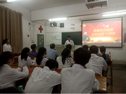 本次主题团日活动设计了观看视频剪辑、分享感悟心得、重温入团誓词和歌唱祖国等环节。同学们以此庆祝新中国成立70周年,向祖国告白,立志报效祖国,为新时代中华民族伟大复兴中国梦的实现而发奋读书,为祖国基层医疗卫生事业而发奋读书。